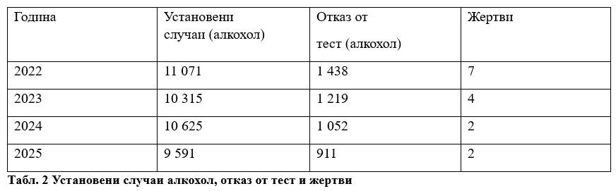 Анализът на данните за установените случаи на водачи, употребили алкохол или наркотици, показва, че през последните четири години независимо от обема на контрола и промените в законодателството, броят на жертвите остава почти непроменен. Ситуацията е подобна и при алкохолните нарушения, като през последните две години се наблюдава статистическо плато.