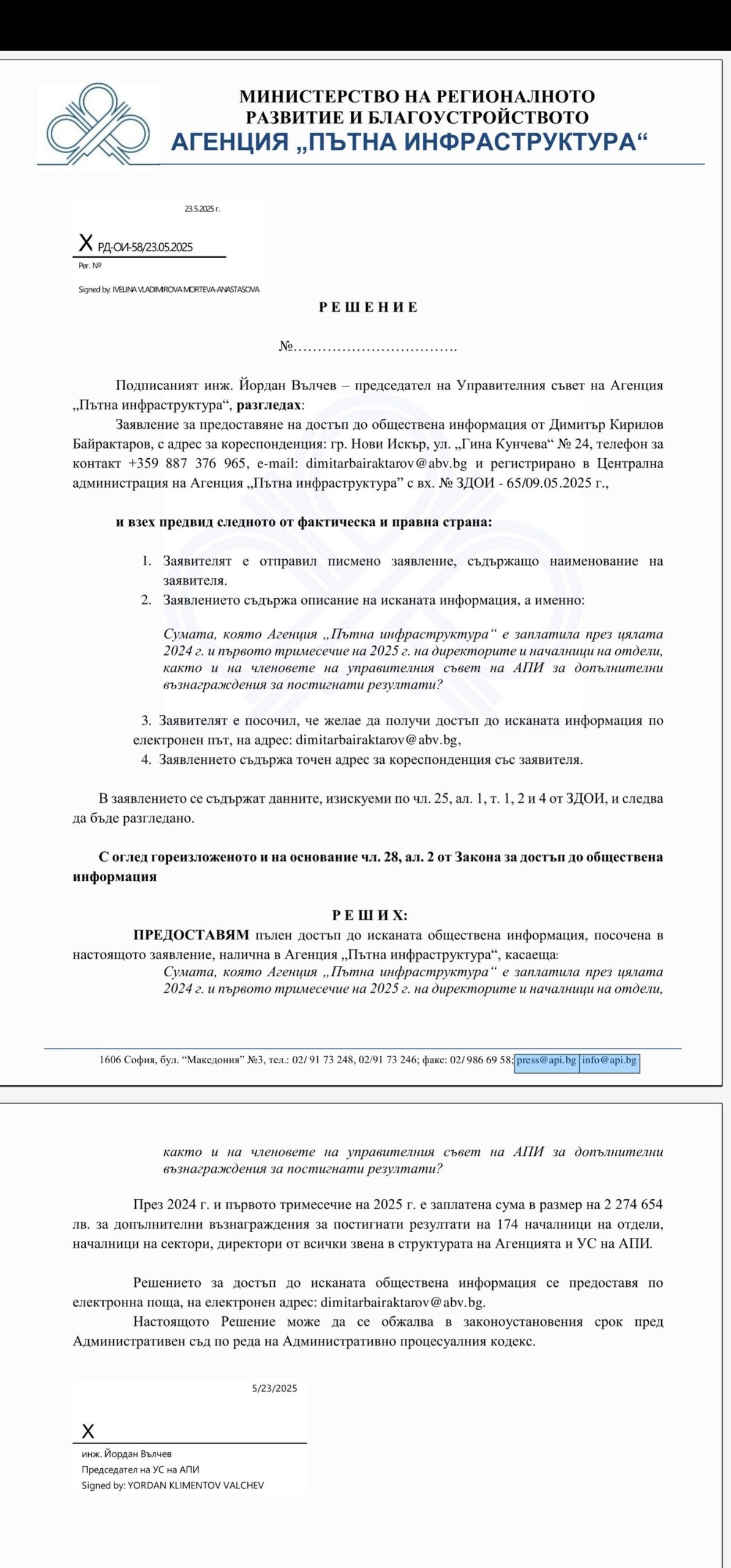 ОТВОРЕНО ПИСМО до председателя на Управителния съвет на АПИ